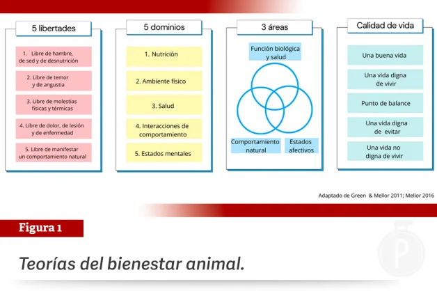 En los últimos treinta años han surgido nuevos paradigmas y definiciones de bienestar animal que incluyen la teoría de los tres círculos (Función biológica y salud, Comportamiento natural y Estados afectivos) [6], Los cinco dominios [10], Escalas de calidad de vida [11], entre otras (ver Fig.1).