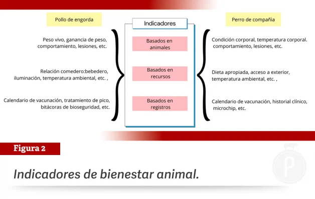 Al utilizar la definición de OMSA como punto de referencia para evaluar el bienestar animal, se pueden clasificar dos tipos de indicadores para poder evaluar el bienestar objetivamente. Es decir, se puede evaluar el bienestar animal basado en indicadores del “animal” o en “recursos”. Los indicadores basados en el animal son aquellos que miden directamente los cambios fisiológicos, conductuales y salud. Mientras que los indicadores basados en recursos son aquellos que indican las condiciones donde los animales habitan. También se pueden considerar los indicadores basados en registros, los cuales son los reportes o registros relacionados al estado de salud, mantenimiento de instalaciones o ambiente del animal. Ejemplos de estos indicadores en escenarios diferentes se pueden observar en la Figura 2.